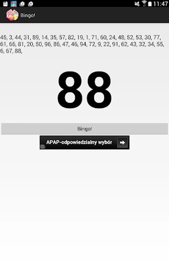 The utility app is designed for all you Bingo lovers that would like to play Bingo and the device that is giving numbers is not at hand or just broken.