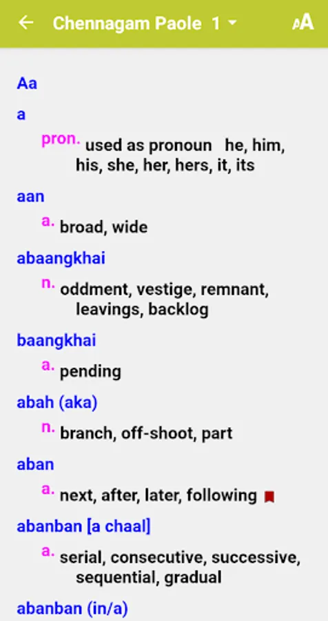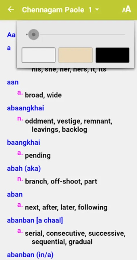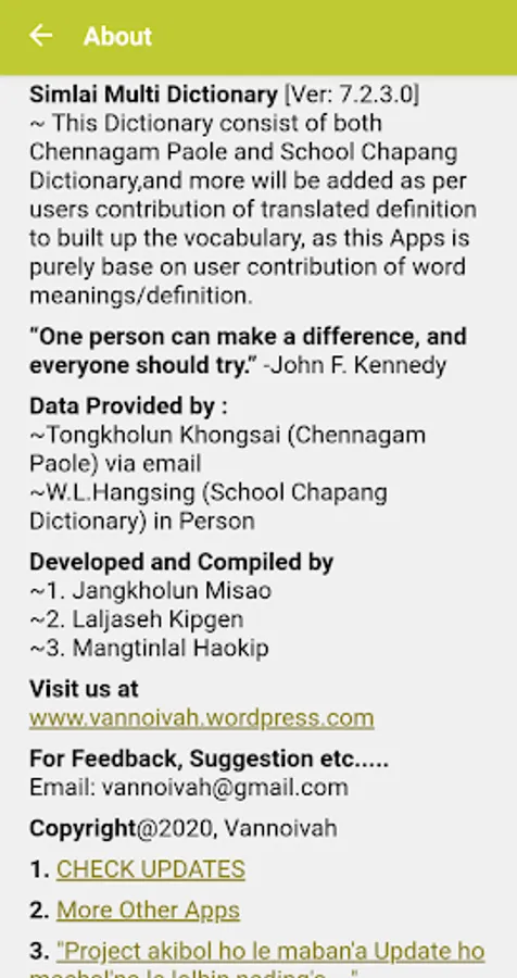 This Dictionary consist of both Chennagam Paole and School Chapang Dictionary,and more will be added as per users contribution of translated definition to built up the vocabulary, as this Apps is purely base on user contribution of word meanings/definition.