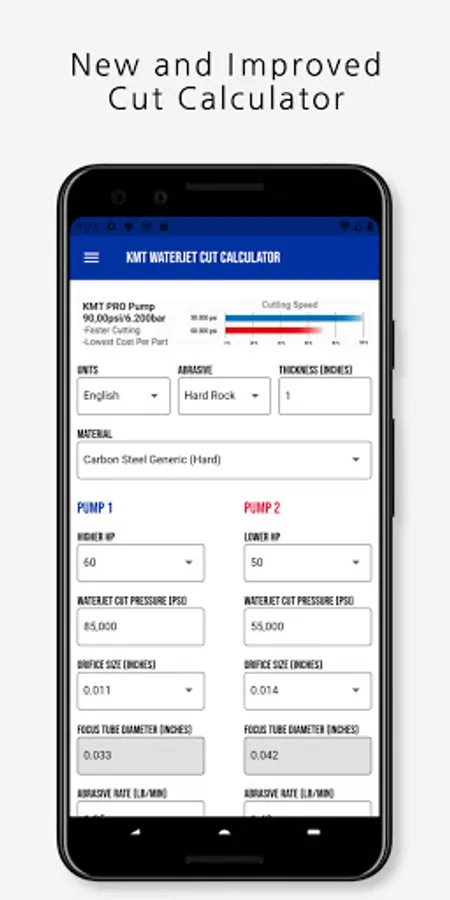 Maximize water jet cutting efficiency and productivity with the free KMT Waterjet Cut Calculator mobile app.