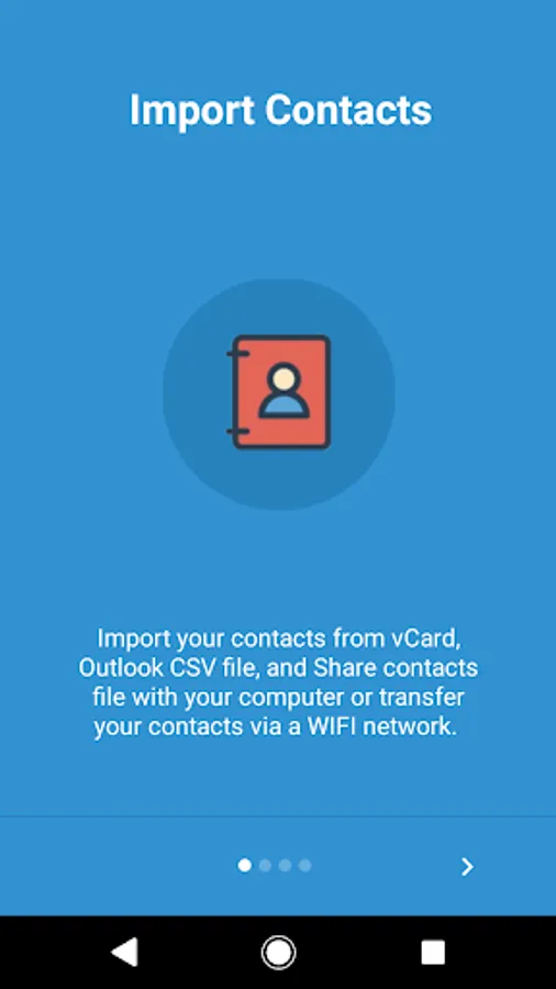 Import your contacts from vCard, Outlook CSV file, and Share contacts file with your computer or transfer your contacts from your old phone to your new phone via a WIFI network.