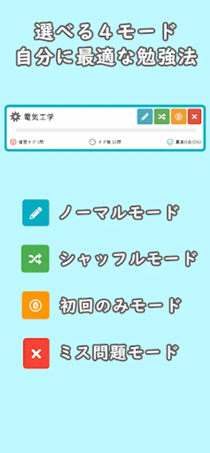 ・ In "Shuffle mode", the questions are the same as in normal mode, but the order in which the questions are asked is random. Prevents you from remembering the answers in the order of the questions.