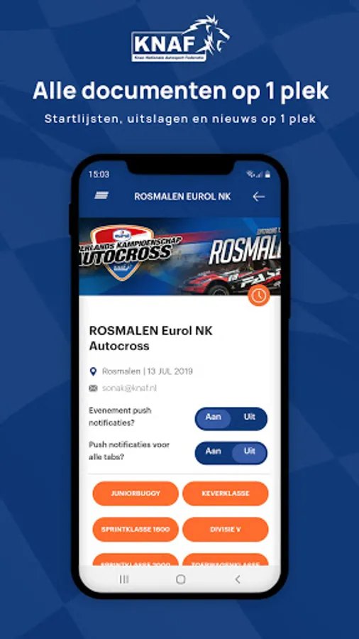 From the 2018 season, the SONAK (Foundation Organization Dutch Autocross Championship) is actively using this app. The app keeps the public and participants informed of the latest updates. For example, we can send push messages per class to the participating teams. This makes the app an official means of communication between the organization and the participants.