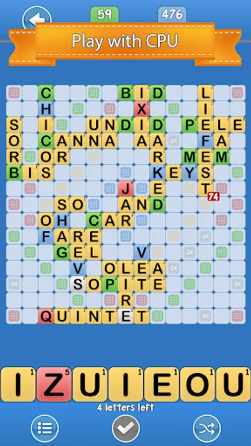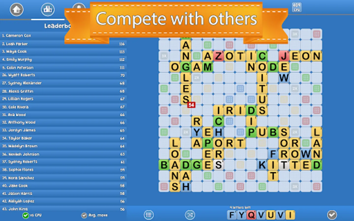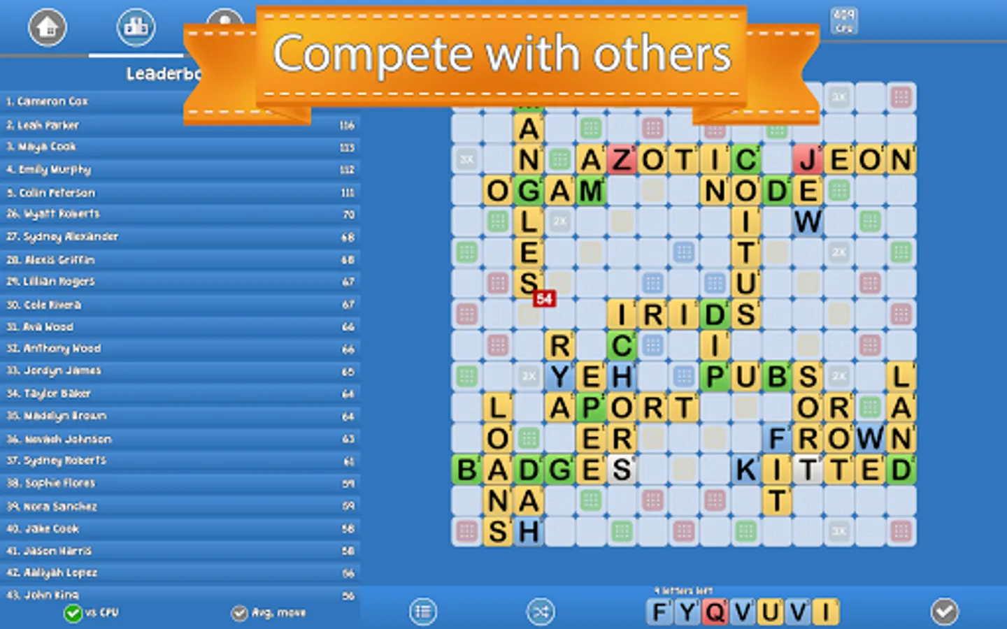 A word game in which players place words of tiles from randomly assigned letters in the shape of a crossword puzzle.