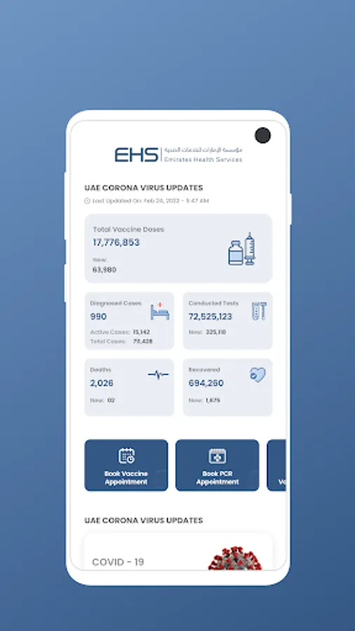 Covid-19 EHS is Coronavirus management App from EHS - Emirates Health Services, EHS. The App provides you with real-time Coronavirus stats in UAE in coordination with National Crisis & Emergency Management Authority UAE and EHS. The App provides facility to book and fully manage your Covid-19 Vaccine as well PCR appointments at your own convenience using your smart phone at any time. EHS is fully committed to provide digital COVID-19 channels to UAE community.
