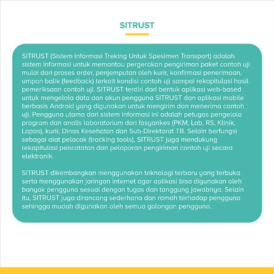 SITRUST (Sistem Informasi Treking Untuk Spesimen Transport) adalah sistem informasi untuk memantau pergerakan pengiriman paket contoh uji mulai dari proses order, penjemputan oleh kurir, konfirmasi penerimaan, umpan balik (feedback) terkait kondisi contoh uji sampai rekapitulasi hasil pemeriksaan contoh uji. SITRUST terdiri dari bentuk aplikasi web-based untuk mengelola data dan akun pengguna SITRUST dan aplikasi mobile berbasis Android yang digunakan untuk mengirim dan menerima contoh uji. Pengguna utama dari sistem informasi ini adalah petugas pengelola program dan analis laboratorium dari fasyankes (PKM, Lab, RS, Klinik, Lapas), kurir, Dinas Kesehatan dan Sub-Direktorat TB. Selain berfungsi sebagai alat pelacak (tracking tools), SITRUST juga mendukung rekapitulasi pencatatan dan pelaporan pengiriman contoh uji secara elektronik.