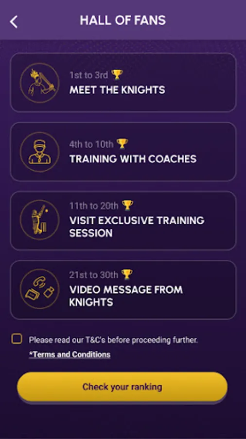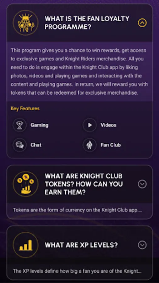 - Fan Loyalty Programme: The KKR Fan Loyalty Programme is designed to reward fans for their dedication and engagement with the team. By using the app regularly and participating in various activities, fans can earn badges, XP points, and Knight Tokens, and unlock exclusive rewards that are not available anywhere else, like exclusive merchandise, souvenirs, and experiences like meeting the players.