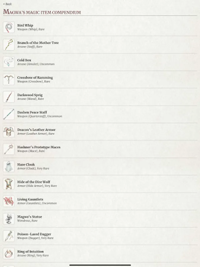 While the compendium is simple to use, it is more than just a random magic item generator. As a dungeon master, you will have the power to generate thousands of random magic items with a single tap. You will also be able to create your own custom magic items or adapt random magic items to fit your game setting. Once you find an item you love, the magic item compendium lets you save it to your phone so you can pull it up quickly the next time you play. To top it all off, the compendium includes a handful of wondrous items that are ready for you to reference and use in your game.