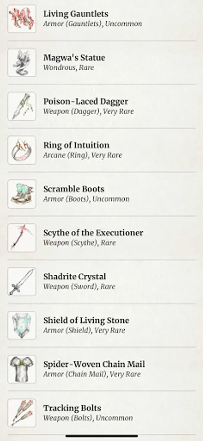 Magwa, the most prestigious scholar of arcane antiquities, has spent his life traveling the Vast Kingdom in search of powerful and fascinating magic items. He has explored the darkest dungeons and braved the dens of dragons to bring you a magic item collection like you've never seen. He has finally published a portion of his discoveries in this mobile application for you to use in your next RPG adventure.