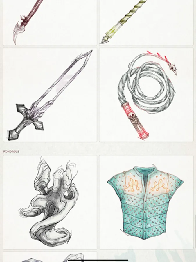 His work includes over 30 free hand-drawn sketches and the option to buy many more. It even includes the ability to randomly generate items, create your own, and save them for later use. Magic, right?
