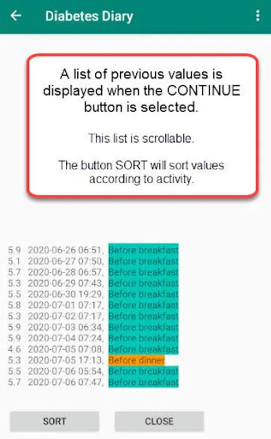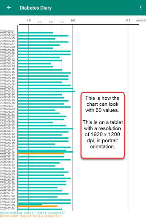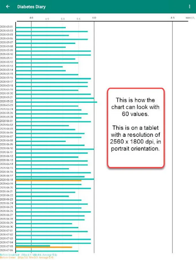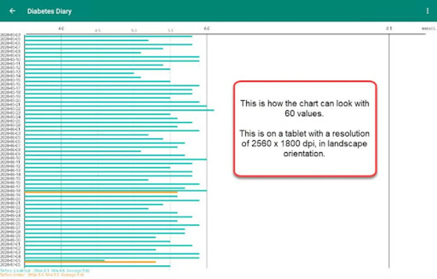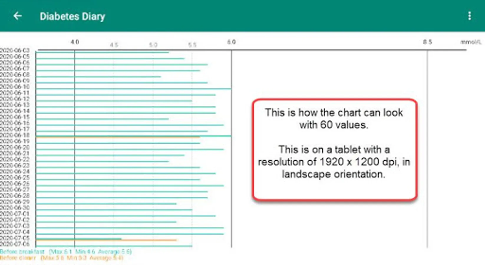 Diabetes Diary makes it possible to enter blood sugar value and to inspect previous values as a list or as a chart. The chart will also display max, min and averages.