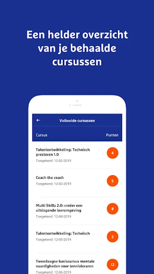 The KNLTB Tennis Teachers App is the app for tennis teachers. Via the app you can easily and quickly find your current license status; the number of PO points you have achieved; the opportunity to register for courses and more.