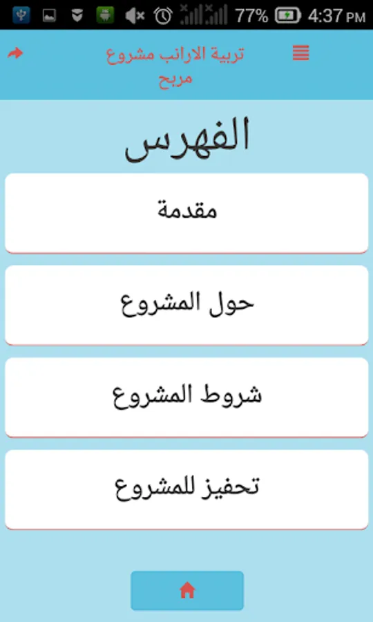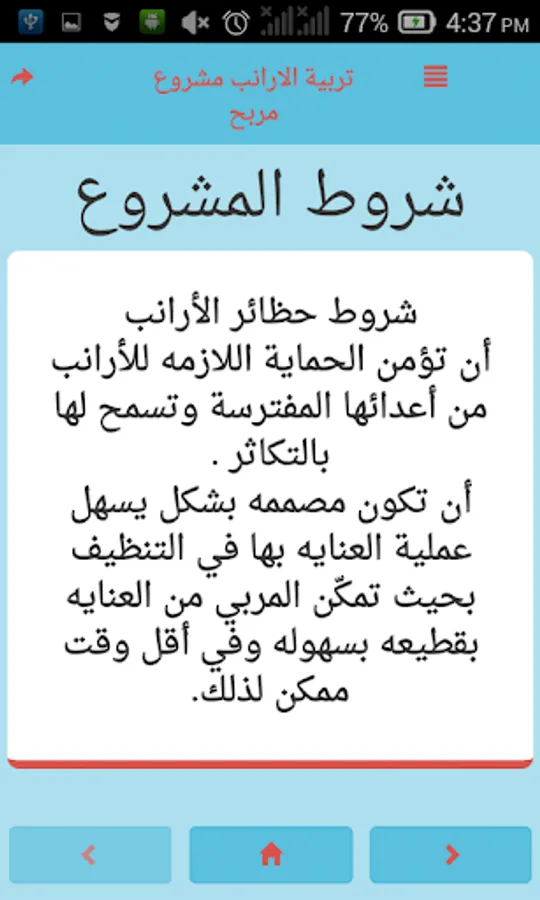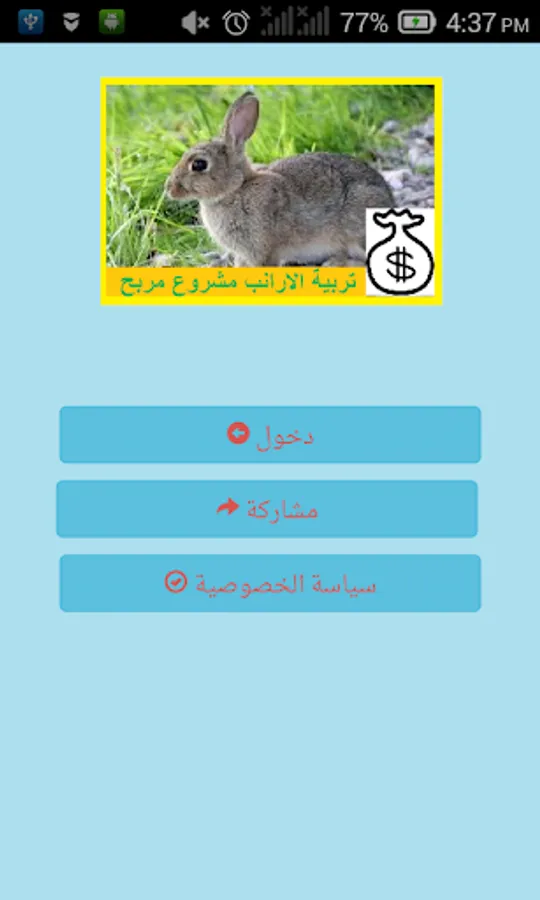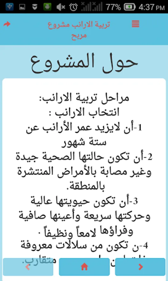 ان من اهم المشاريع الفلاحية المربحة هي تربية الارانب نظرا لغلاء فروها ولحمها والطلب المتواصل عليها ، لذلك يوجد العديد من الشباب الذي ينوي مباشرة هذا المشروع ولكنه في حاجة الى معلومات حوله ، ونحن من خلال هذا التطبيق البسيط سنقدم لكم معلومات تحتاجونها كثيرا للمضي قدما ماعليكم سوى تقييم التطبيق ومشاركته مع من ينوي المبادرة في هذا المشروع