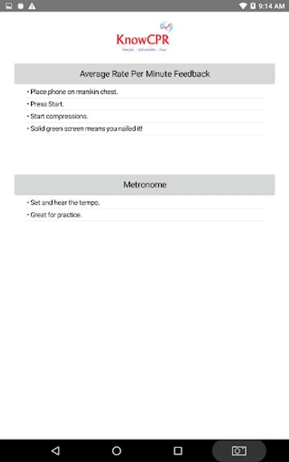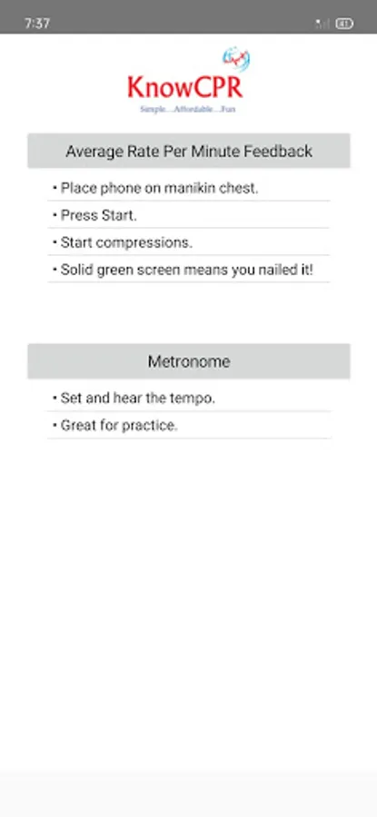 Real-time Rate Per Minute Feedback for Compressions App. This App is used to assist instructors validate the rate of compressions during classroom instruction of CPR. A link is provided for you to share with your students prior to class. The link will allow each person to download an app to their own phone. The student then places their phone on their manikin's chest as they provide compressions. The app calculates the rate of compressions. Real-time feedback is provided to help guide the students. If compressions are the correct rate then the screen is green. If too slow the screen is yellow. If too fast the screen is red. If the screen flickers -- you are almost there. If the screen stays green your student has nailed it! Between 100-120 per minute. This device is only to be used for instructional purposes with an authorized CPR instructor. A Metronome is also included.