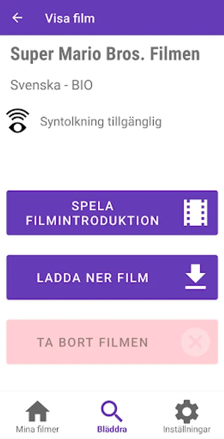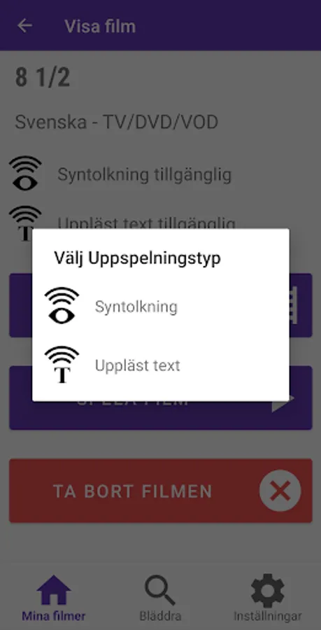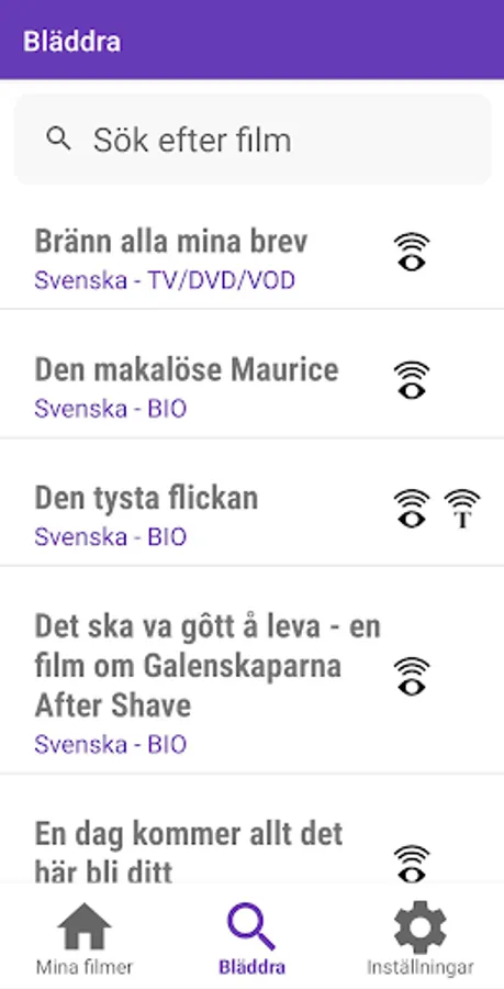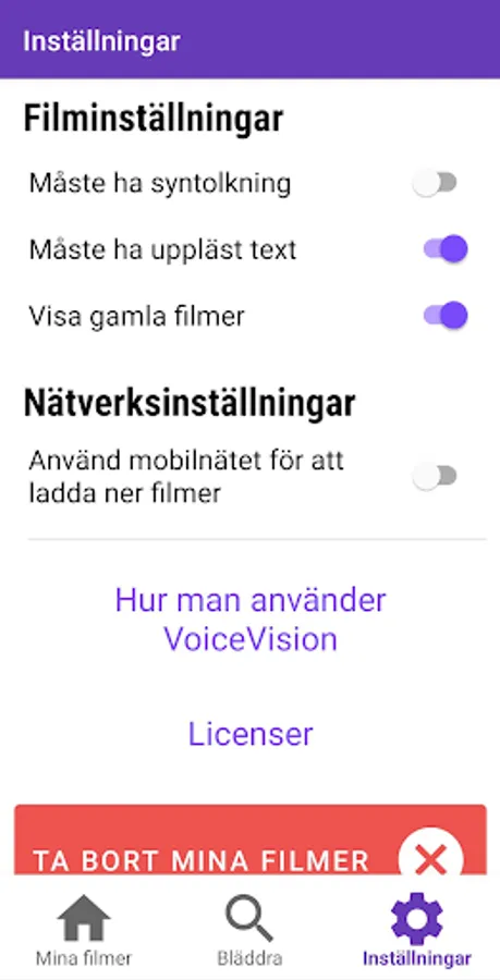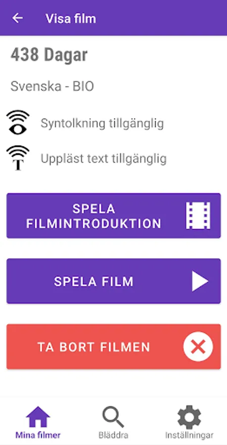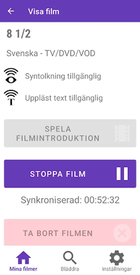 VoiceVision is an implementation of Accessible Cinema by the Swedish Film Institute. With VoiceVision, you can enjoy movies at the cinema or at home on your TV couch with audio description and narrated text. The app detects where you are in the movie and automatically plays the audio description and narrated text without you needing to adjust anything yourself. All you need to do is choose the movie you want to watch in the app and start the playback. Now the app is ready for the movie, and when the app detects where you are in the movie, the sound will be played.