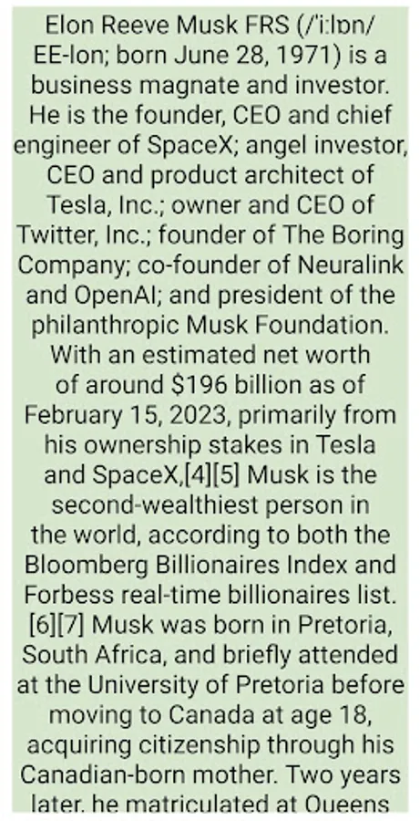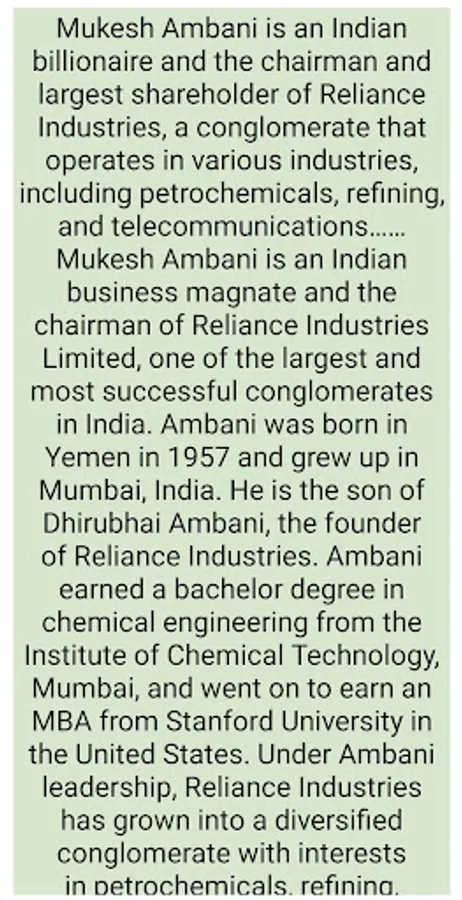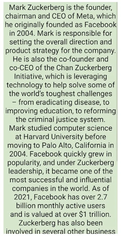 Our app features an easy-to-use interface that allows you to browse through the profiles of the billionaires 20 with just a few taps. You can filter the list by industry, country, or net worth, and read about each billionaire's background, career path, and notable achievements.