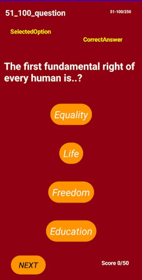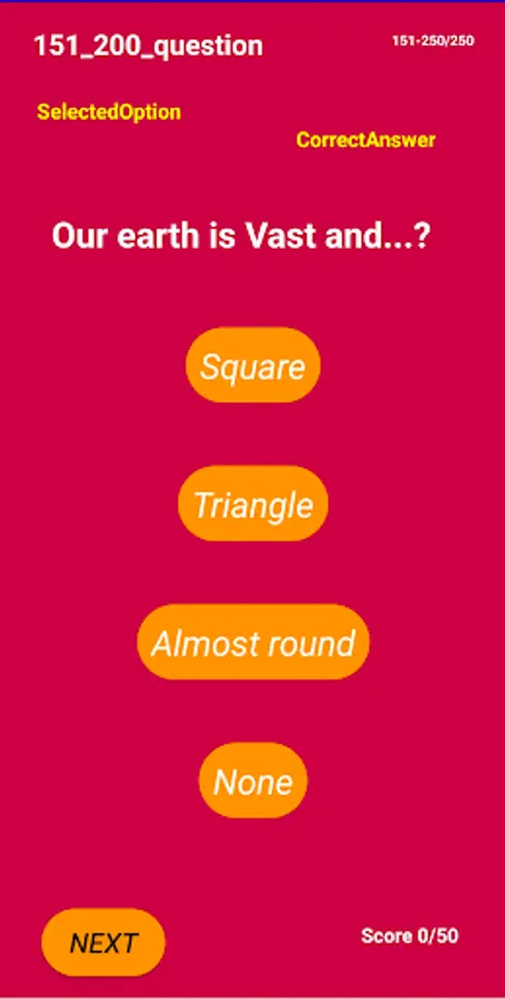 Where 1 question and that have 4 answer, when you select answer one message is appear the answer is Right or Wrong and also select and correct option is appear on top of the page, app count your answer and give you final result.