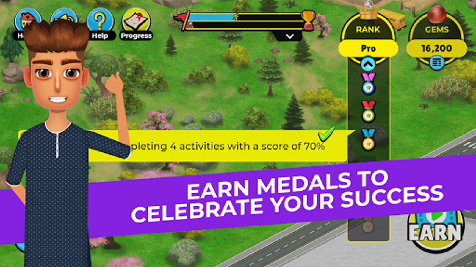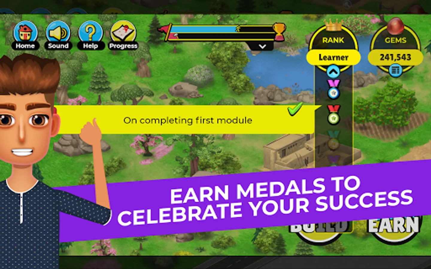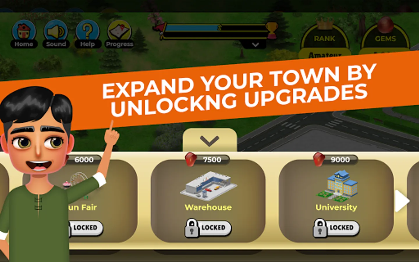 Earn gems by successfully completing challenges and use them to unlock and upgrade buildings on your map.
