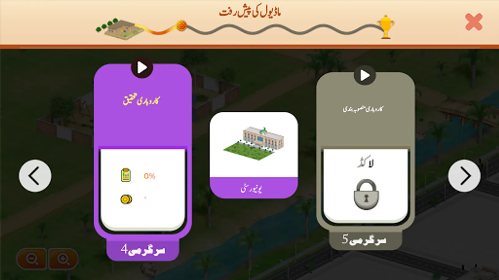 The lessons are available in both English and Urdu and are unlocked through the buildings on the map of a farmland. The player can earn coins by watching videos and then successfully completing the corresponding challenge. As the player gains more and more coins, they will be able to buy new upgrades for the various buildings that are unlocked in their farmland.