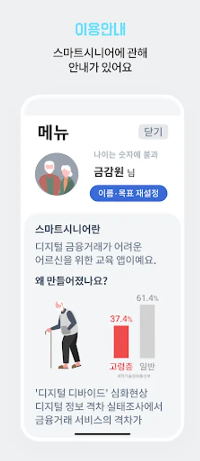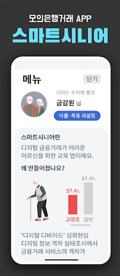 - The digitally underprivileged, who experience inconvenience in financial transactions due to the disappearance of branches, had difficulty accessing and learning even if they wanted to use smartphone banking, but now they can freely practice using 'Smart Senior'.