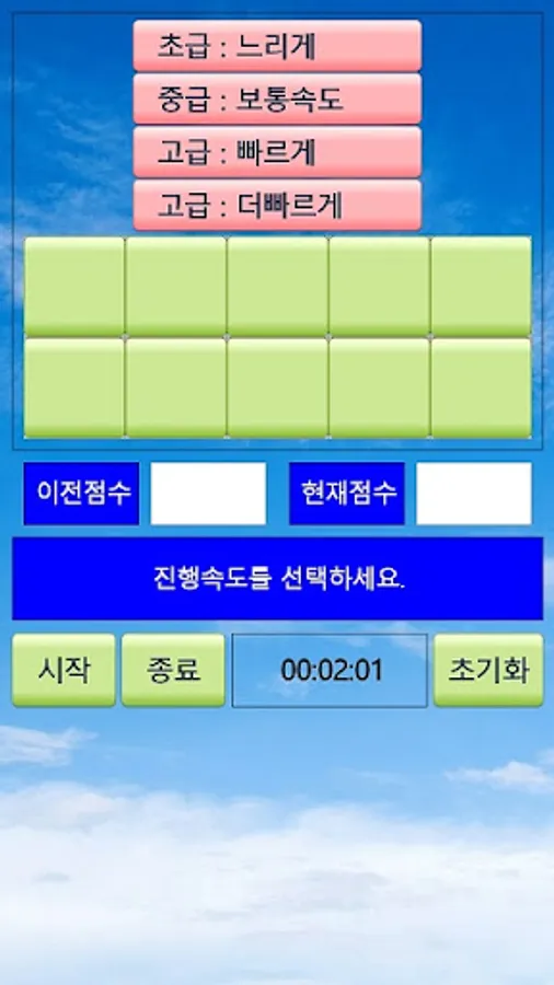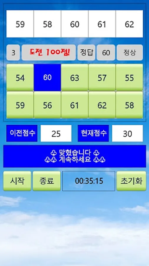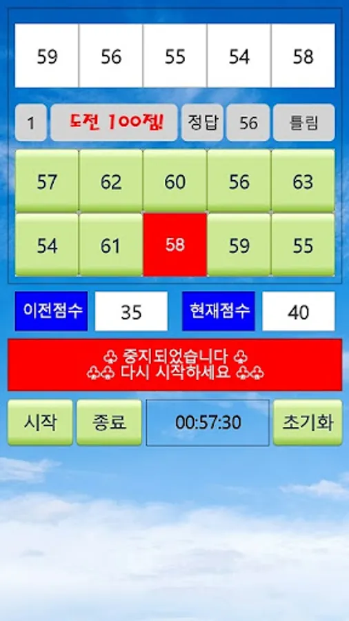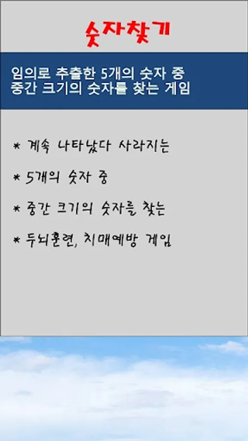 When 5 randomly selected numbers are arranged in order of size among 10 numbers, it is a game in which the middle number is guessed. If you answer correctly, the clicked cell turns blue and points are added continuously, but if you skip or don't answer correctly, the clicked cell turns red and all cells become blocked and you cannot proceed further. When you click Cumulative Usage Time, the total time calculation starts, and when you click End, the total time is saved.