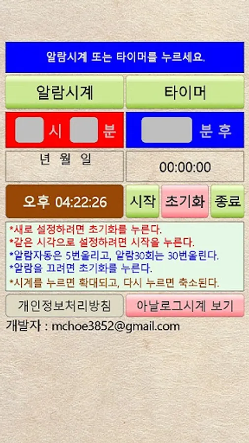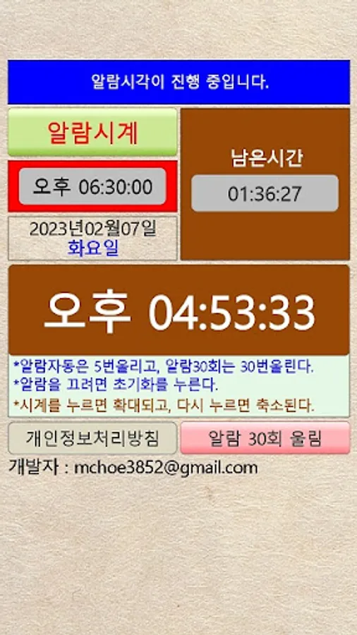 (1) If you set an alarm using the alarm app and try to see how much time is left in the middle after going to bed, the screen is off due to the automatic turn off of the smartphone screen, so turn on the smartphone again, and then turn on the small digital screen on the top of the smartphone. You should look at your watch. (2) If you set an alarm time while studying and try to see the elapsed time in the middle, the screen turns off after a while due to the automatic turn off of the smartphone screen, so you have to keep turning the screen on. By the way, this alarm app does not turn off the app screen unless you turn it off on purpose. Even if you close the app for a long time and open it again, as long as the app is open, the screen does not turn off, an alarm sounds at the exact time, and whether the alarm has ended is also displayed. Therefore, you can see the large clock from time to time without turning on the app screen cumbersomely, and you can conveniently use the alarm clock and timer while viewing the remaining time and progress.