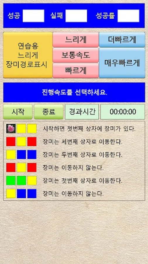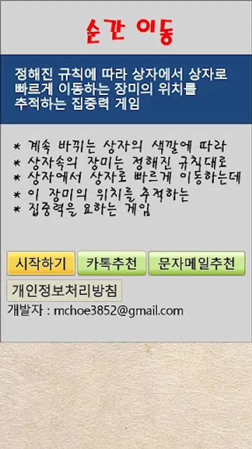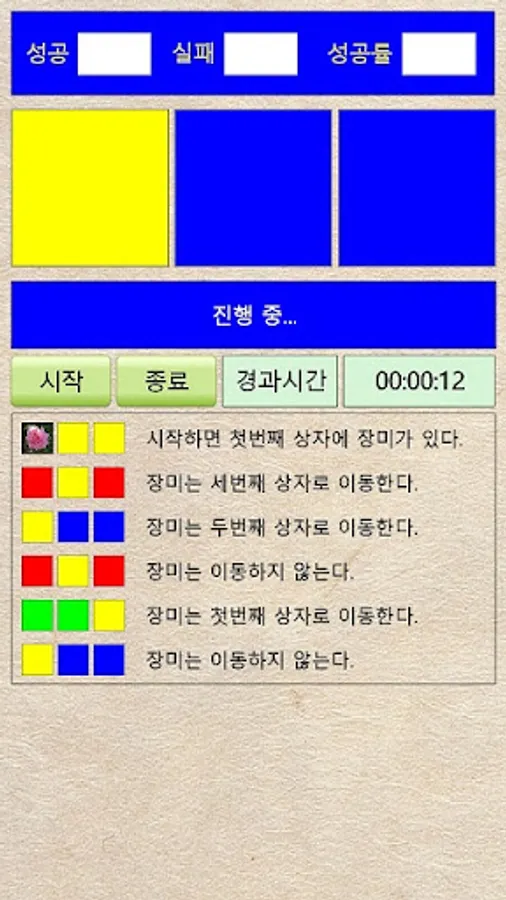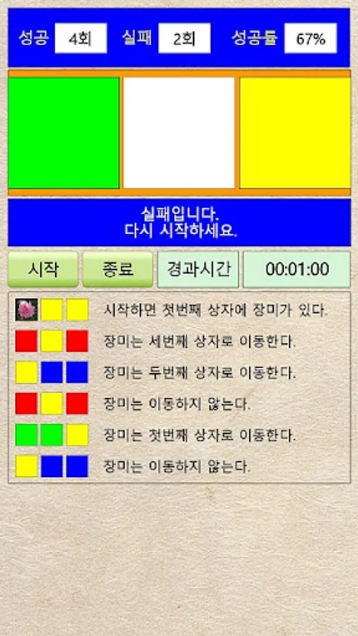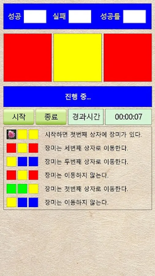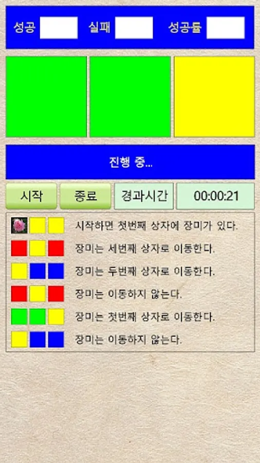 The color of the three boxes keeps changing, and as the color of the box changes, the rose moves quickly from box to box according to the set rules. The rose stops after moving for 1 minute. At this time, it is a game that requires concentration to guess the location of the box containing the rose. Play this game before work or study. Eliminates distractions and improves concentration to increase efficiency. It is good for brain training, prevention of dementia, and perfect for killing time.