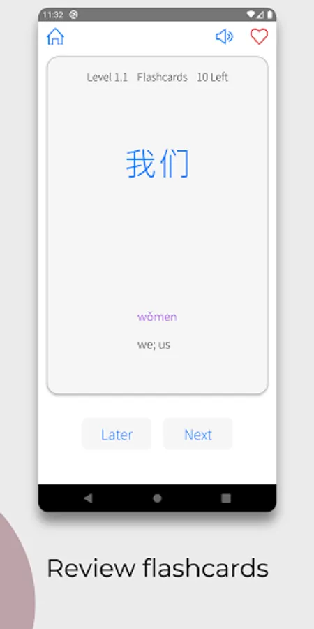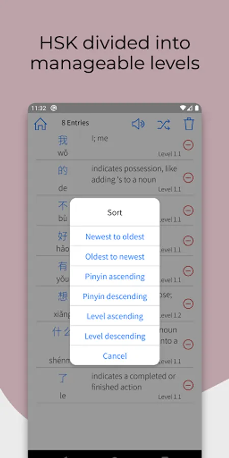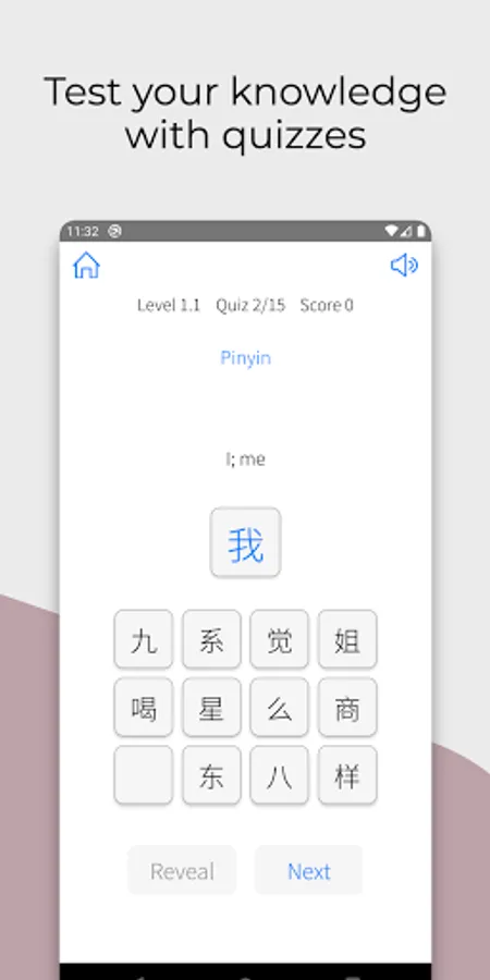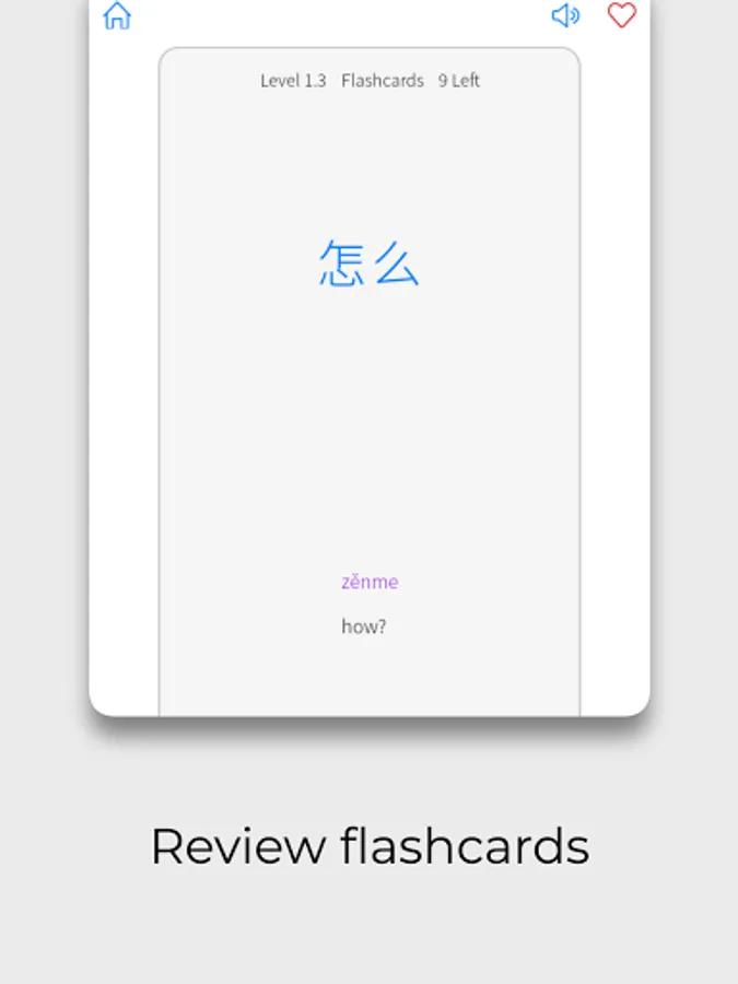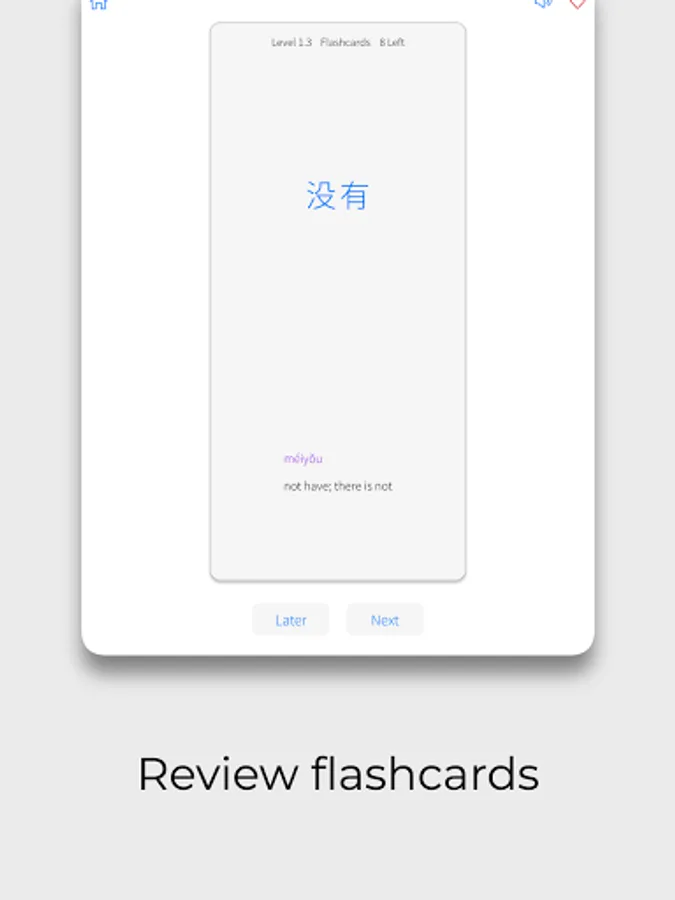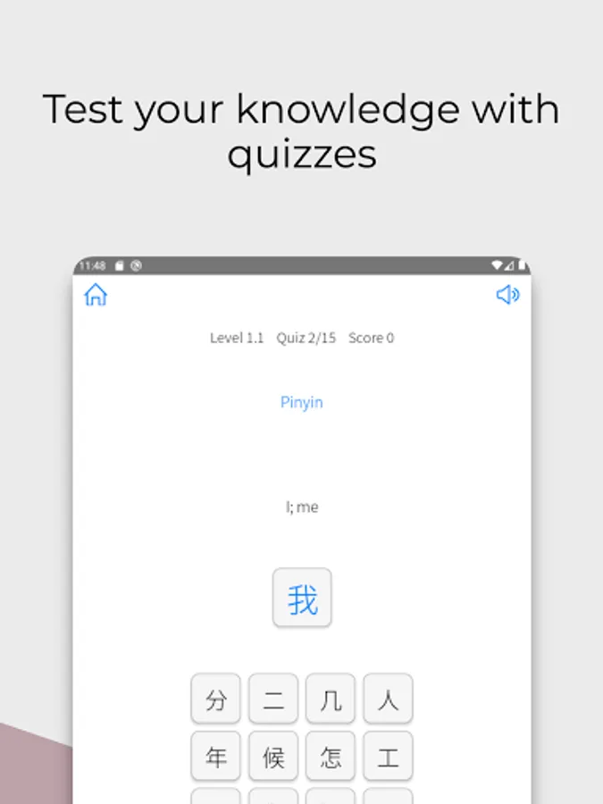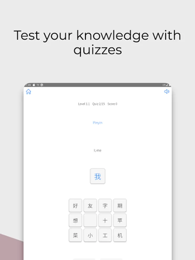 BEST APP for learning and growing your Mandarin Chinese vocabulary. Innovative quizzes help you test your knowledge and identify new characters to learn. Review FLASHCARDS to memorize characters, and to reinforce memory through recall and repetition. App keeps track of your progress. App records and displays your quiz results to provide feedback for improvement, while problem words are added to the flashcard list for review.