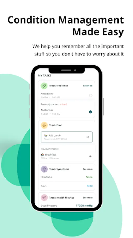 1. Manage medications, symptoms, vitals, diet, exercise, check-ups, and more