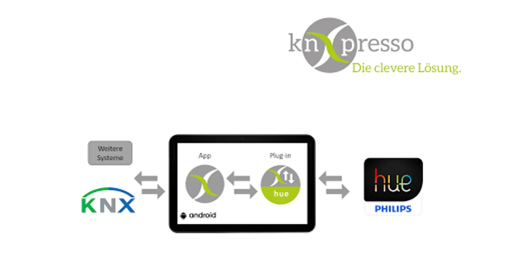 The knXpresso hue plug-in also allows the various Philips hue bulbs to be operated via the KNX bus. Thus, normal KNX switches, as well as the operating and monitoring elements of the knXpresso app can be used to control the Philips hue bulbs.