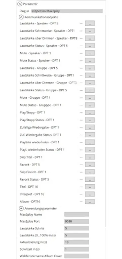 This plugin allows Max2play to communicate with the KNX bus via knXpresso. Thus, KNX devices (e.g. buttons) as well as the operating and monitoring elements of the knXpresso app can be used to control the Max2play devices.