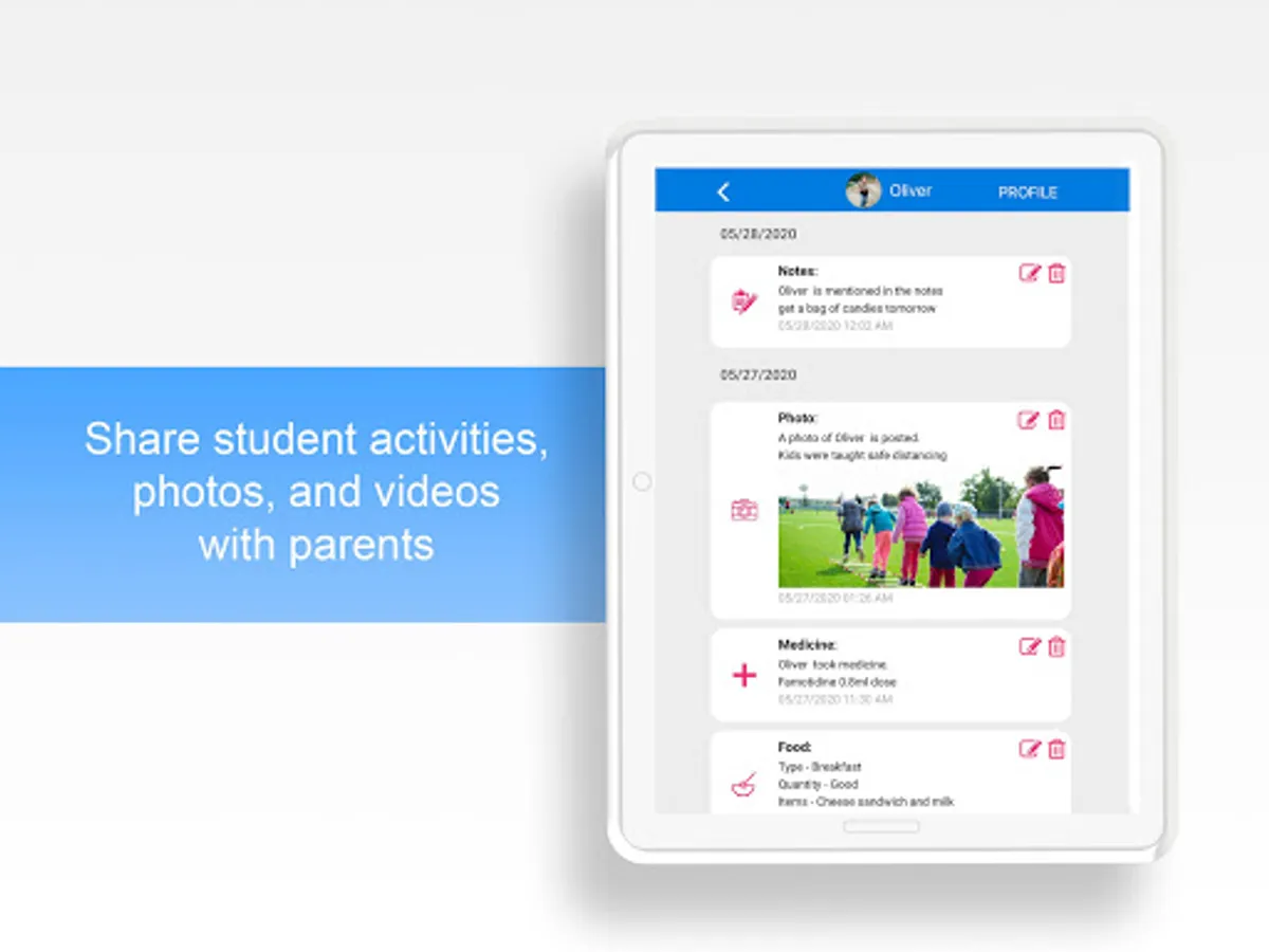 Photo/Video Sharing - Share images or videos with parents instantly and keep them updated about their child daily activity.