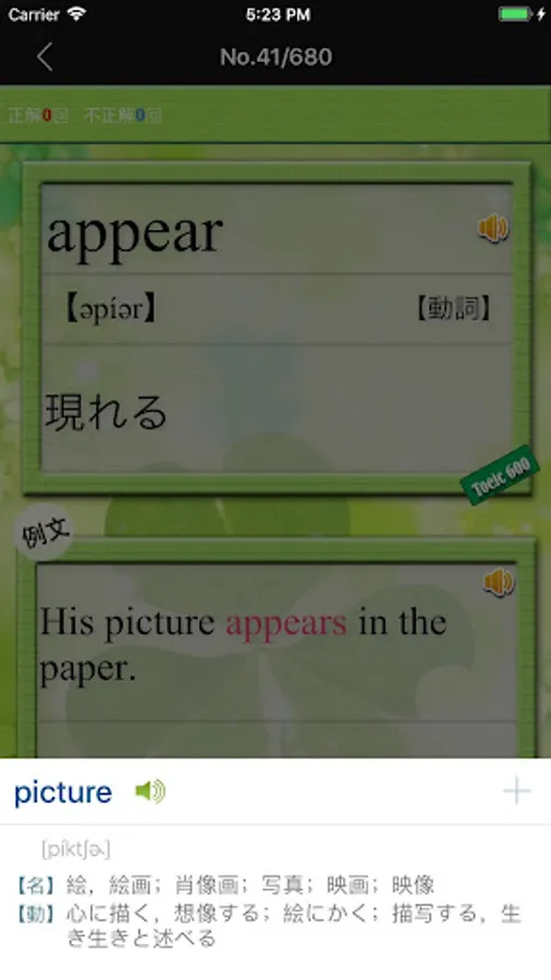 -The word card contains English pronunciation, example sentences and interpretation sentences.