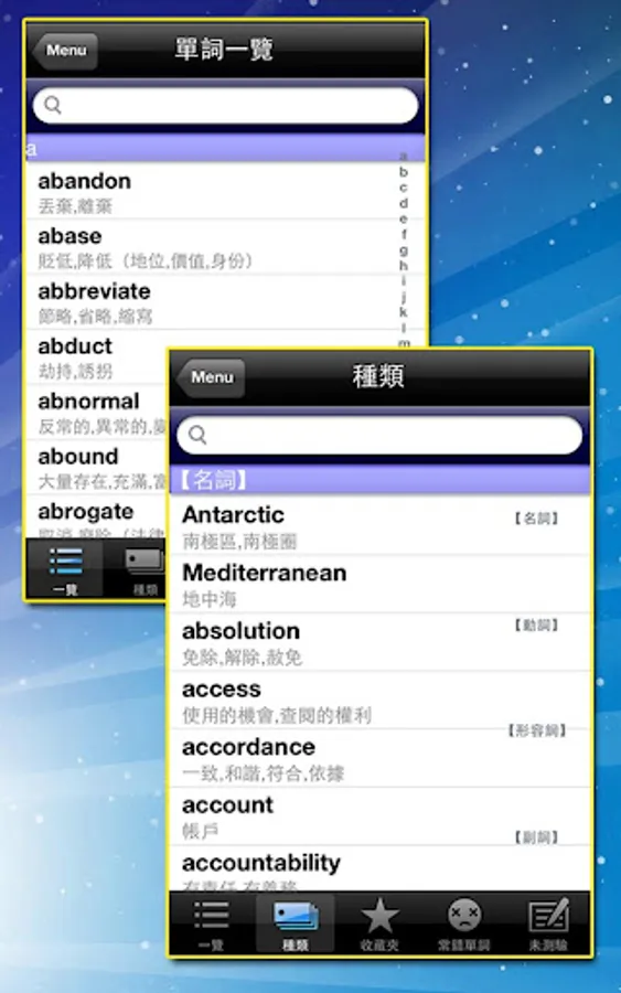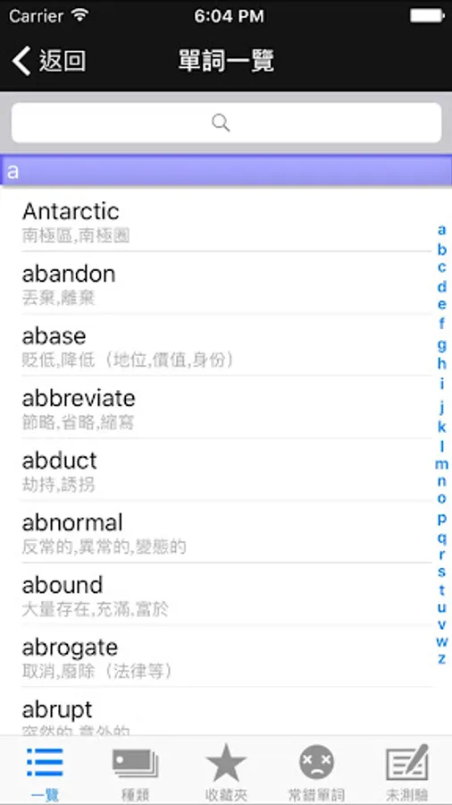 此功能主要包含了所有單詞的一覽,檢索和收藏;