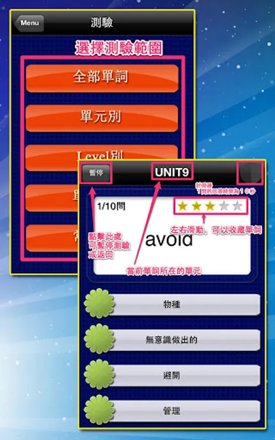 可以選擇測驗範圍,設定測驗條件,對您已經學習過的單詞進行測驗;