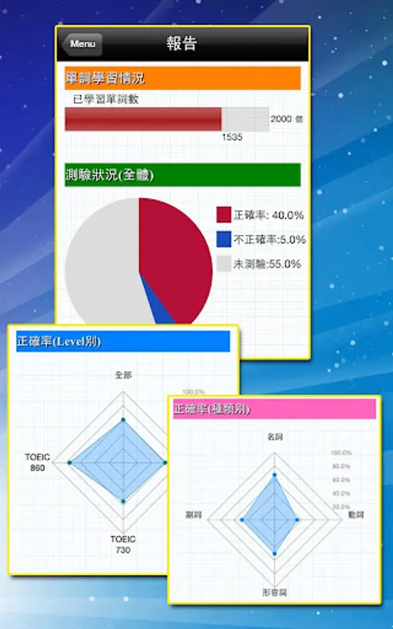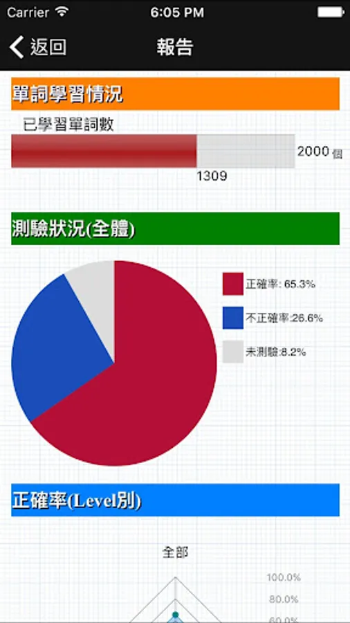 ・測驗狀況:以餅狀圖展示的正確率,不正確率以及還未測驗過的單詞比率;