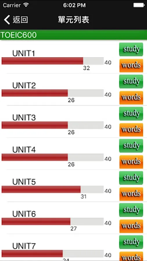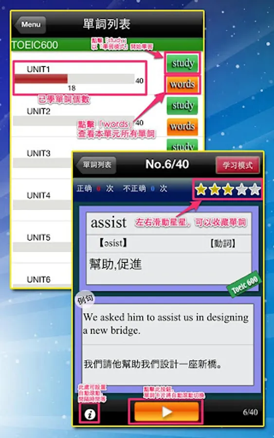此功能主要是將2000個單詞劃分為50個單元,每單元40個單詞;科學的單元分劃可以讓您循序漸進、輕鬆地記住單詞;