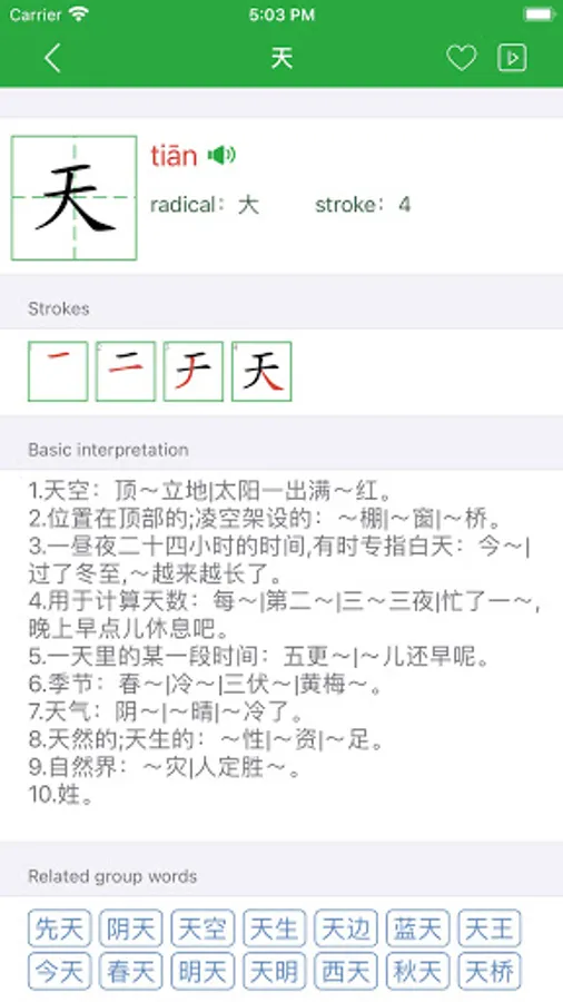 ・Check detailed description of Chinese characters, including related group words, explanations, etc.