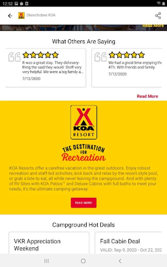 At KOA, we believe camping is more than just pitching a tent or parking your RV. It's about creating memories, exploring new places, and experiencing the great outdoors with the people you love. With our app, we make it easy to find the perfect campground for your next trip, and to manage your reservations and rewards all in one place.