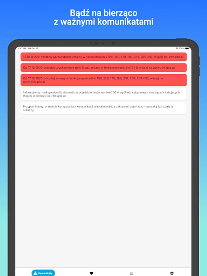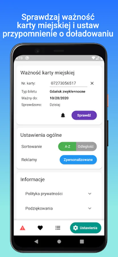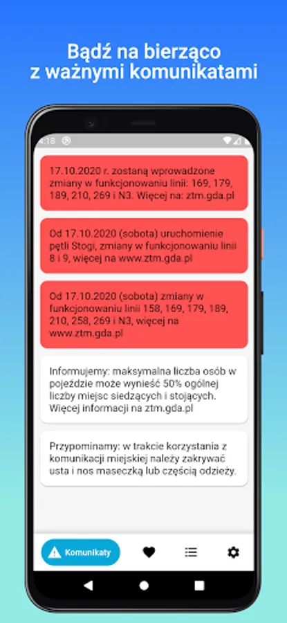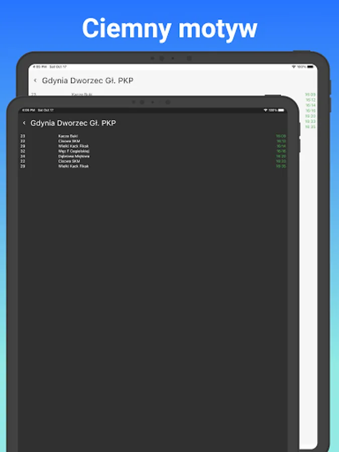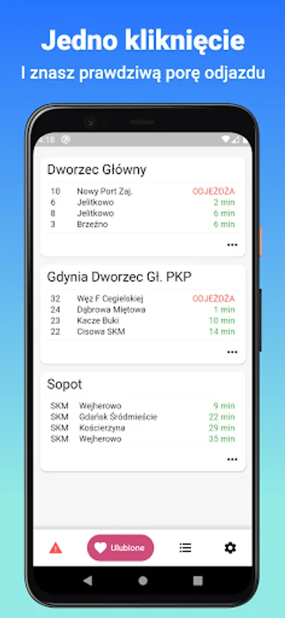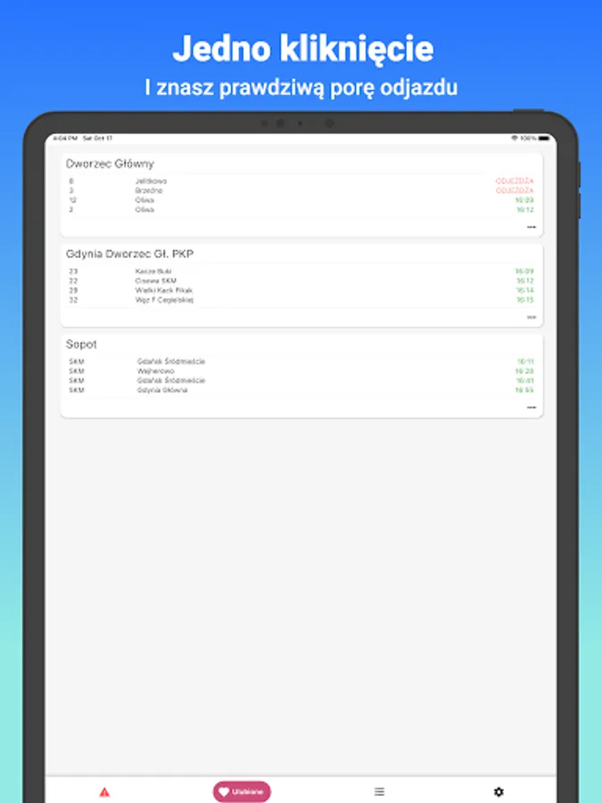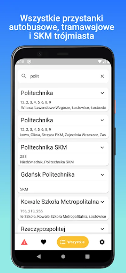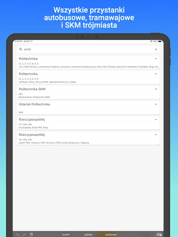 Currently, the application supports the Tri-City agglomeration, i.e. Gdanśk, Sopot and Gdynia. There are also stops in other cities if there is a supported operator, such as Pruszcz Gdański.