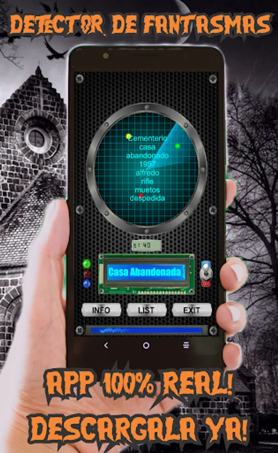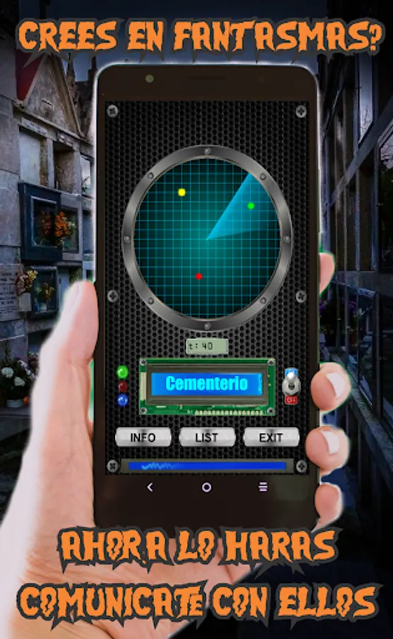 Radar detector Ghosts is an application that uses electromagnetic and radio sensors of our device to interpret the changes and changes in these fields, thus using algorithms specially designed is capable of detecting spectral parecencias and quantum flux, such as ghosts, entities and any type of force or energy that can modify and vary the magnetic fields of our environment.