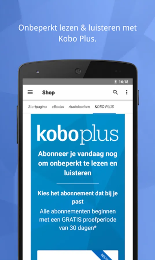 All you have to do is sign up for Kobo Plus via bol.com and you will receive a library of books in your app. The first 30 days are free and the subscription can be canceled monthly. Read butrr!