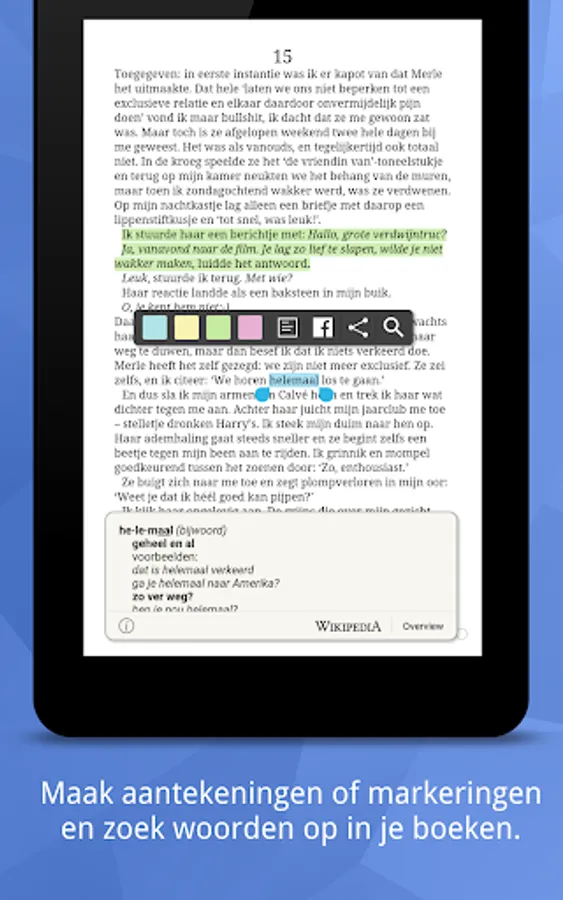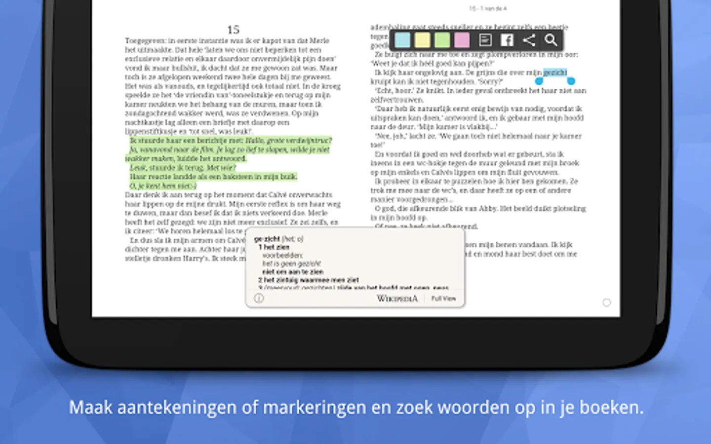 In an ebook you come across a word whose meaning you do not know and complete chaos seems to arise. No, nothing wrong, because for exactly these situations, the bol.com kobo app has a button with a dictionary function. Handy!