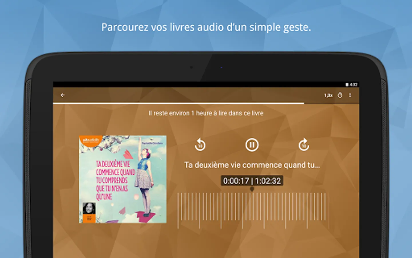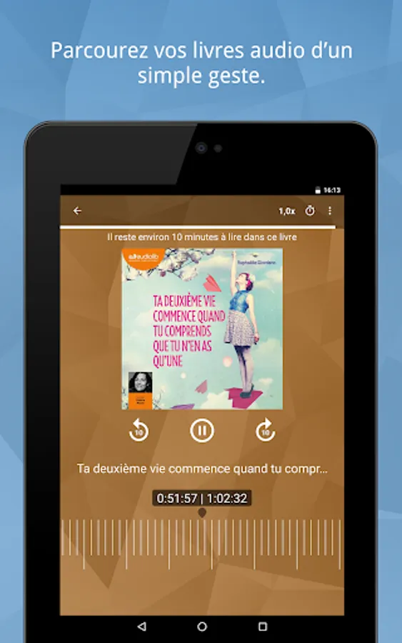 • Our easy-to-use, beautifully designed player puts browsing through your audiobook at your fingertips. Don't worry: you won't lose track and can even see how much time you have left at a glance. Schedule it to turn off after a certain period of time. This is perfect for listening before going to sleep.