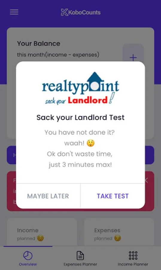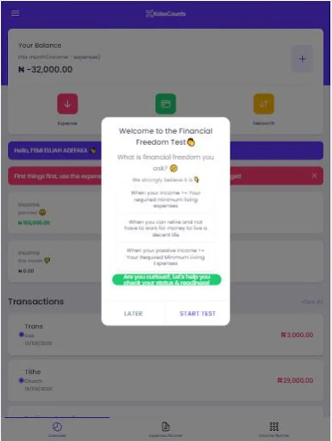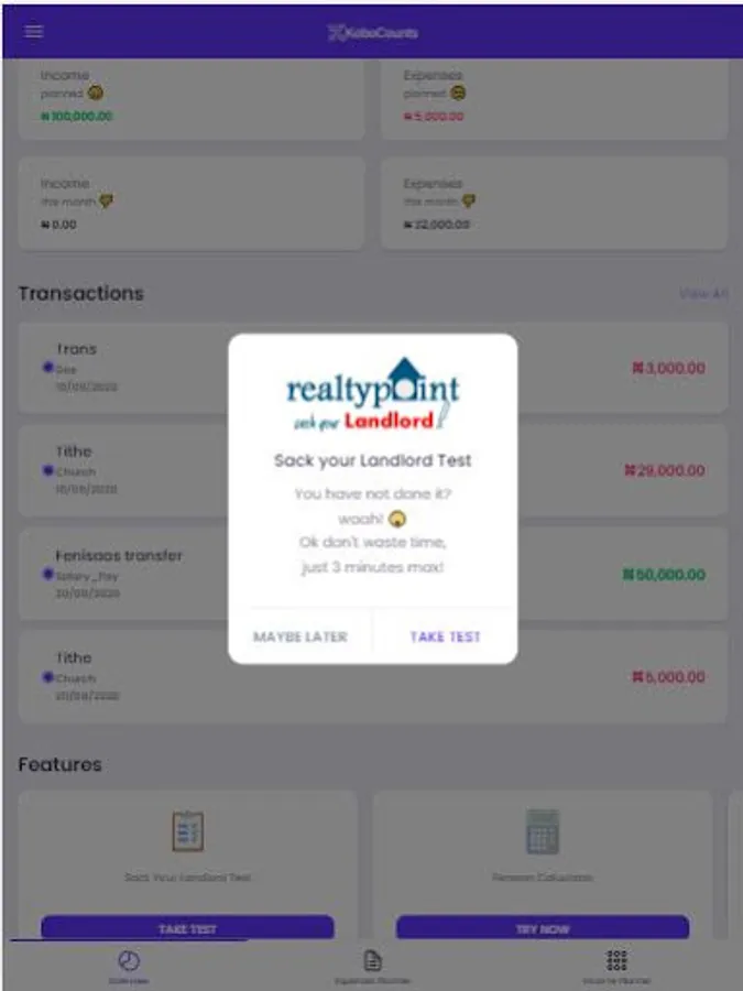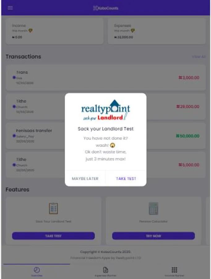 Start your journey to financial freedom with KoboCounts, KoboCounts is body of tools for improving your financial health featuring a budget palnner, Networth Calculator, Financial Freedom Test and Lots more, and is a product of Realtypoint point limited (RC 621592) is a dynamic multifaceted Pan-African real estate going concern primarily involved on the supply side of the industry with strong presence in REAL ESTATE Development, Investment, Publishing, Training/Consultancy and Marketing Syndications. Partnering with reputable industry players to deliver pocket friendly real estate solutions to our target market(s) is the core of our business strategy.