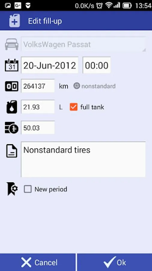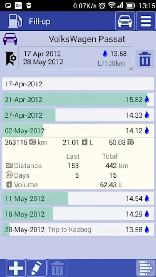 When you buy fuel just enter current odometer value, volume you filled and amount you purchased.