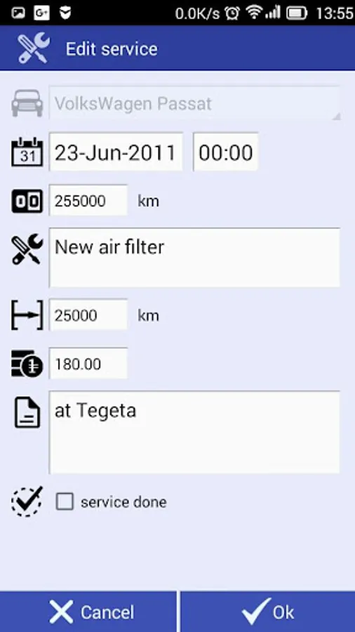When you are in a service station just enter current odometer value, what is done, amount you purchased. You will be notified if you specify the distance after which you want to repeat this service.
