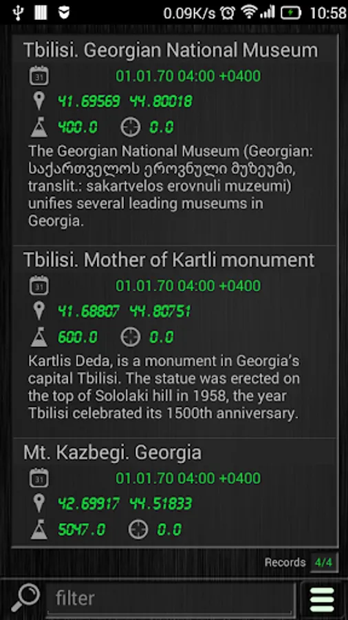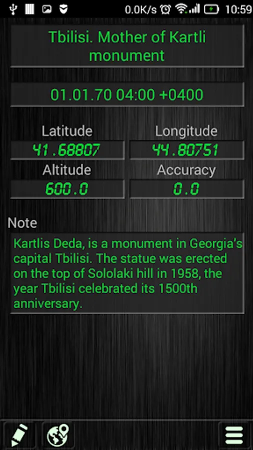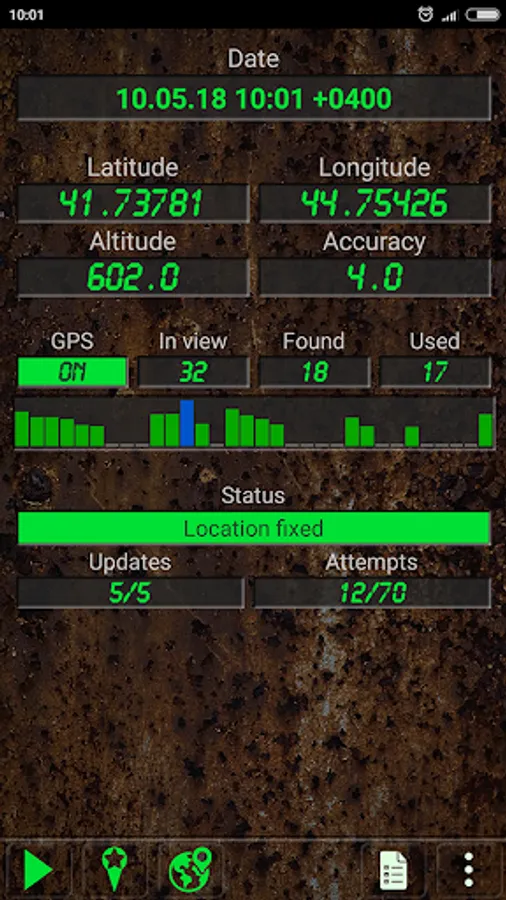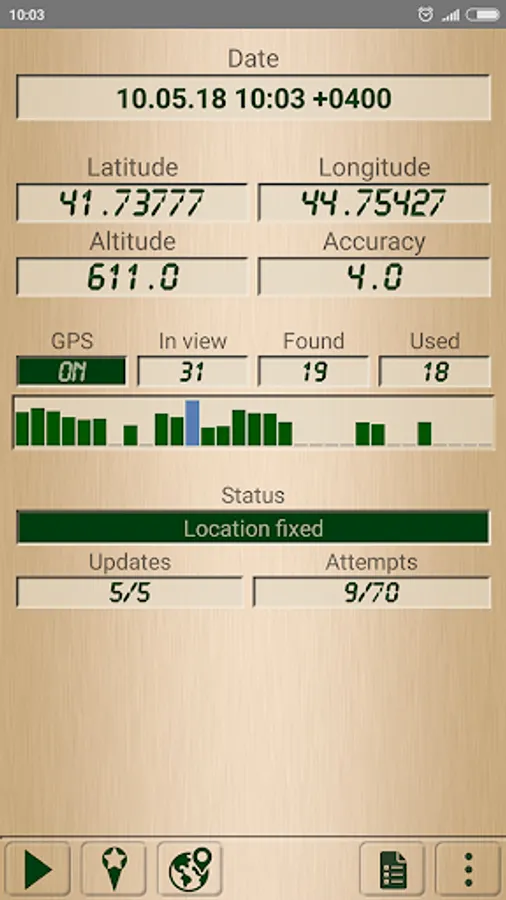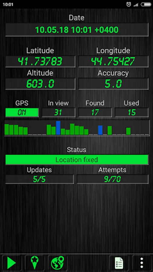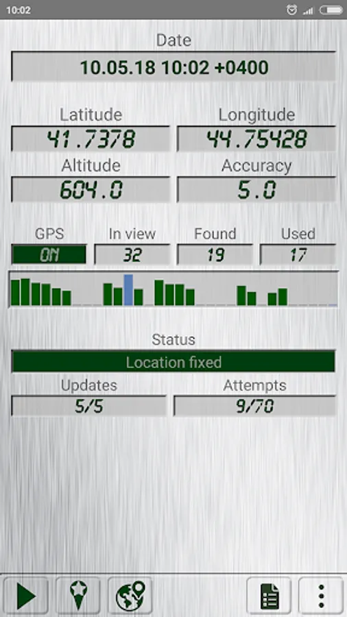 - Shows Latitude, Longitude, Altitude, Accuracy, Date/Time. Satellites in view, found, used. Location updates and reading attempts.