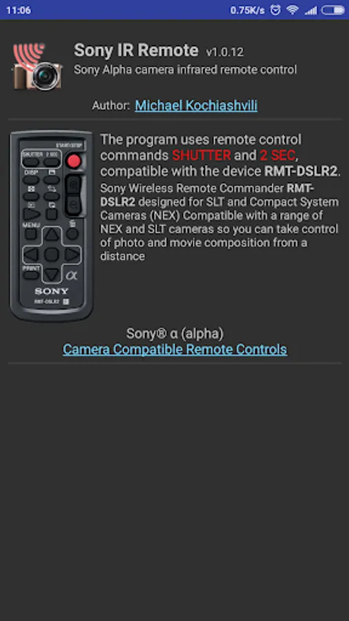 IR remote for Sony camera uses remote control commands "SHUTTER" and "2 SEC", compatible with the device RMT-DSLR2.