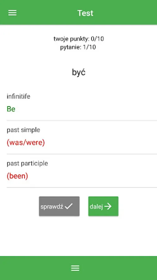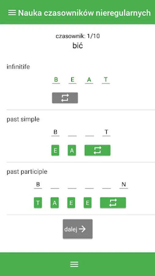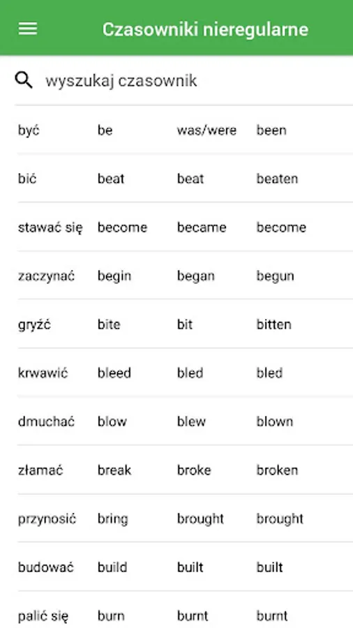 An app for learning the most common irregular verbs in English. The application supports learning by keeping correct statistics and incorrect answers on the test. In this way, you first learn the weakest irregular verbs.