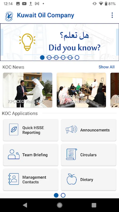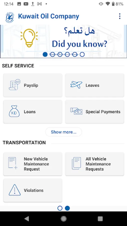 2. Transport Module for KOC employees with KOC cars ( Submit a New Vehicle Maintenance Car Incident Request, Check Status & Details of your Car Incident Requests, Track the location of the driver while serving your request, Cancel your Request, Check Employee's Car Traffic Violations, Check Fuel Consumption (Only managers and above).